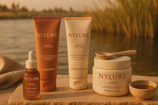 Nylure began while I was trying to help my wife, Jenny, feel like herself again. We discovered gentle botanical traditions from my Egyptian heritage that calm irritation, support moisture, and protect fragile hair. Now, that care is being shaped for women everywhere who want to reclaim their control and confidence.